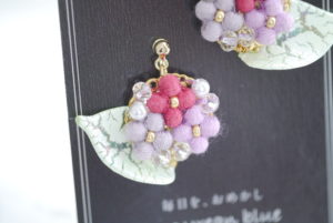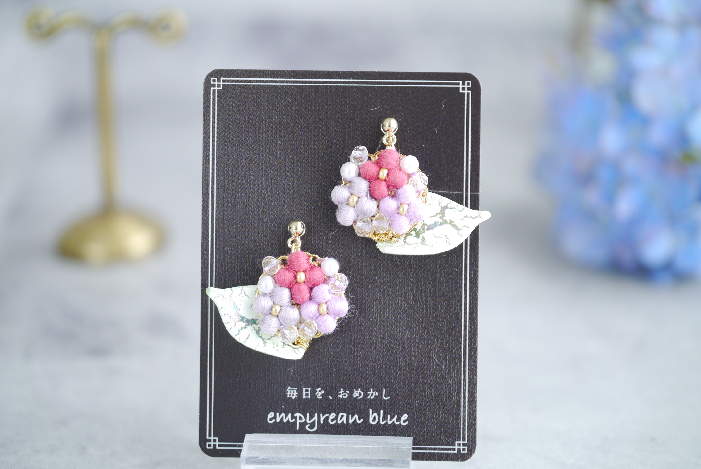 小庭の紫陽花 お品書き 2025.10.082024.09.01 紫陽花を味わうアクセサリꔛꕤ*。゚ パキッとしたマゼンタに一目惚れ♡ “紫陽花の季節”を視覚から感じられるように シンプルな作品に仕上げました𓈒 𓏸 𓐍 お花から葉っぱへと枝垂れるイメージで 散らした雨粒もお気に入りです^^ 2125 I-101 小庭の紫陽花(イヤリング)※ピアス変更可 ¥9,980-