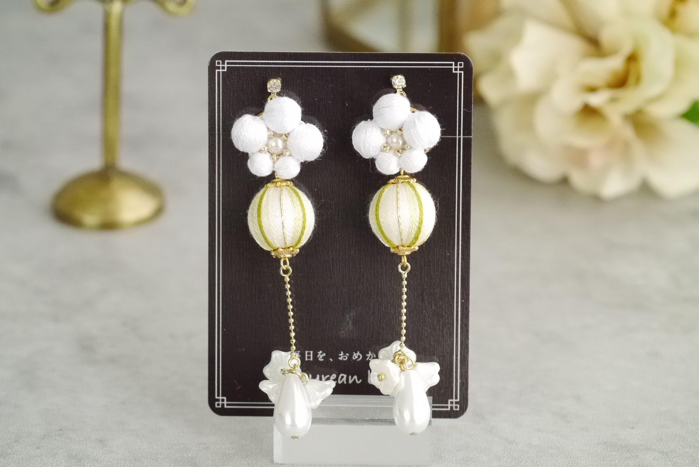 こんもり梅の耳飾り(白梅)-ロング- お品書き 2025.10.082024.08.04 こんもりとデフォルメした梅のモチーフと 和のテイストを一気に盛り上げる若草色の春色のコンビ。 ポニーテールに映えるロングタイプのアクセサリーです*° 枝、一輪一輪に “ギュッ”と力を合わせたように咲き誇る姿を表現したくて 小花を集めたデザインにしてみました₊❀̥୭ 2125 I-116 こんもり梅の耳飾り(白梅)-ロング-※ピアス変更不可 ¥8,700-